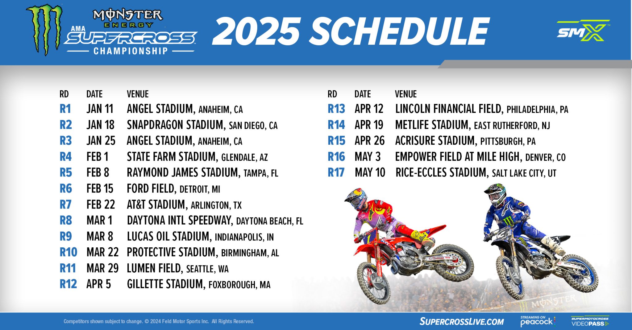 Dates and venues for the 2025 SuperMotocross World Championship Finals, fueled by Monster Energy and subsequent ticketing information will be released in the coming months. The 2025 SuperMotocross schedule is here with a full roster of AMA Supercross, Pro Motocross, and the SuperMotocross Playoffs